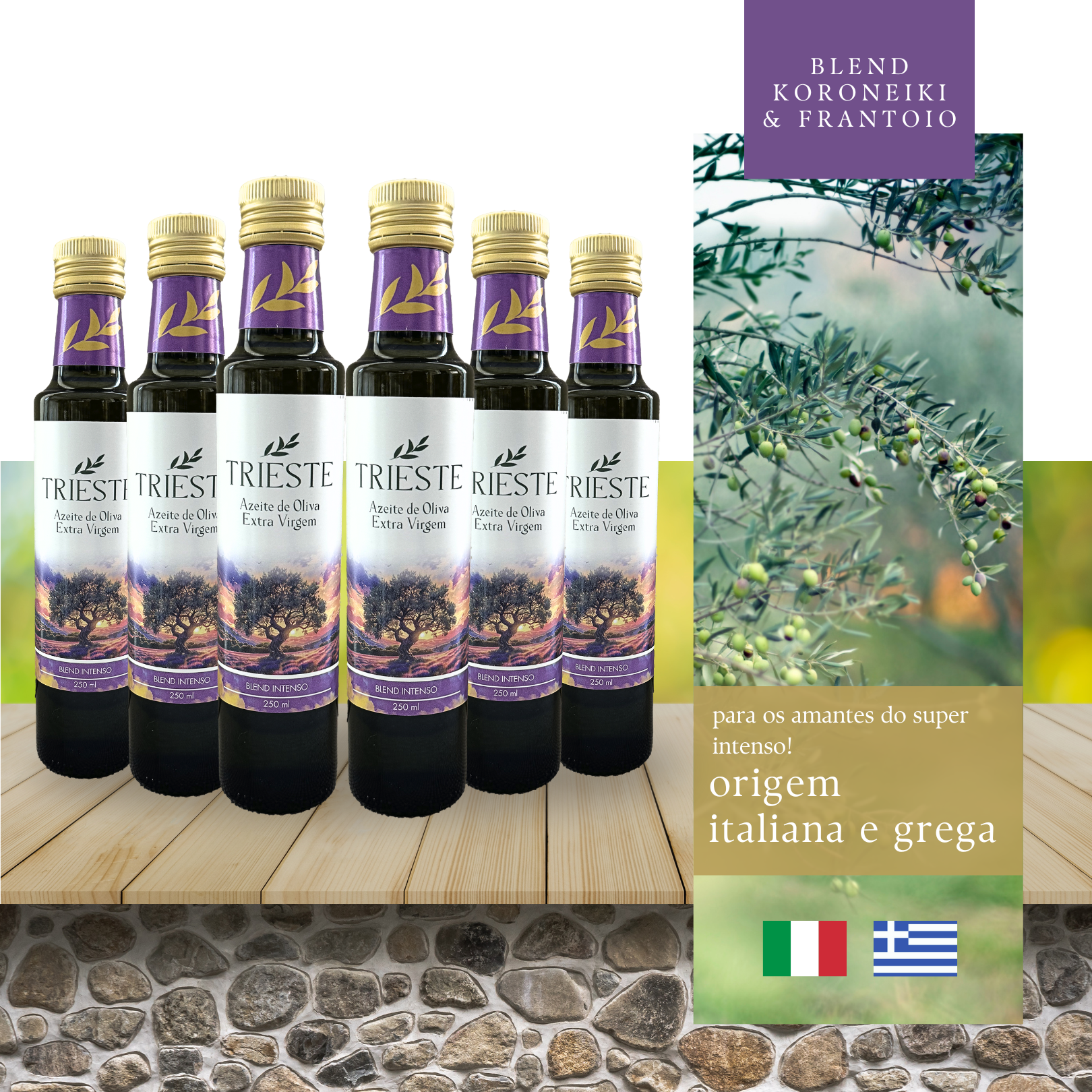 Conteúdo: caixa com 6 Unidades de Azeite Extra Virgem (250ml) Blend Intenso – Koroneiki e Frantoio.