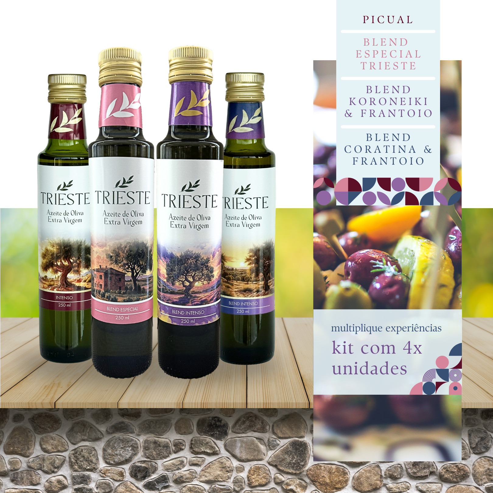 1 x Blend Intenso – Coratina e Frantoio, 1 x Blend Intenso - Koroneiki e Frantoio, 1 x Intenso - Picual e 1 x Blend Especial - Trieste.